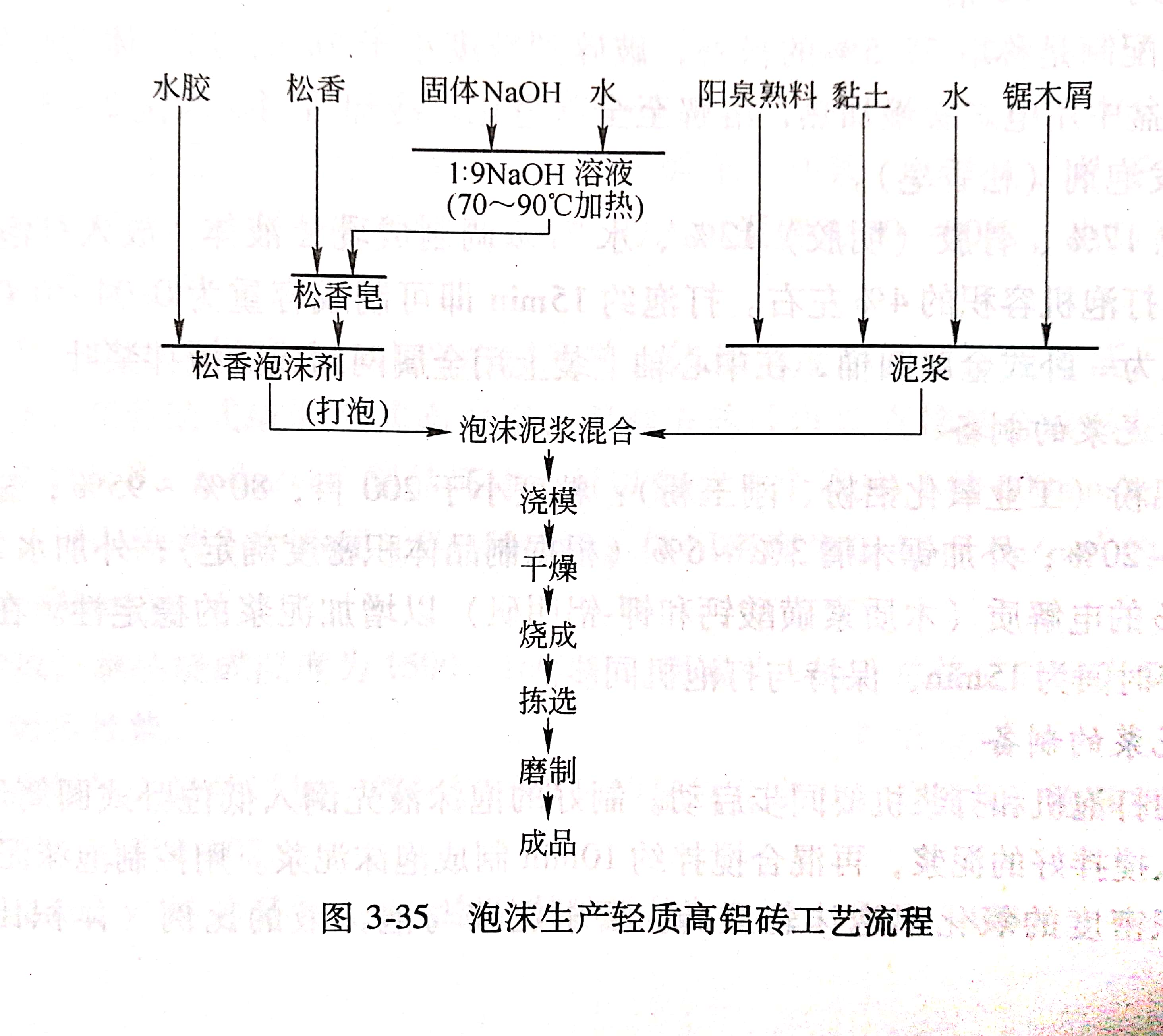 用泡沫法可以生產體積密度較低的(0.4~0.8g/cm')氧化鋁輕質磚。 這種體積密度低的氧化鋁輕質磚,使用溫度高、熱導率低,是各種高溫窯爐使用的保溫節能爐襯耐火材料,其生產工藝流程如圖3-35所示。